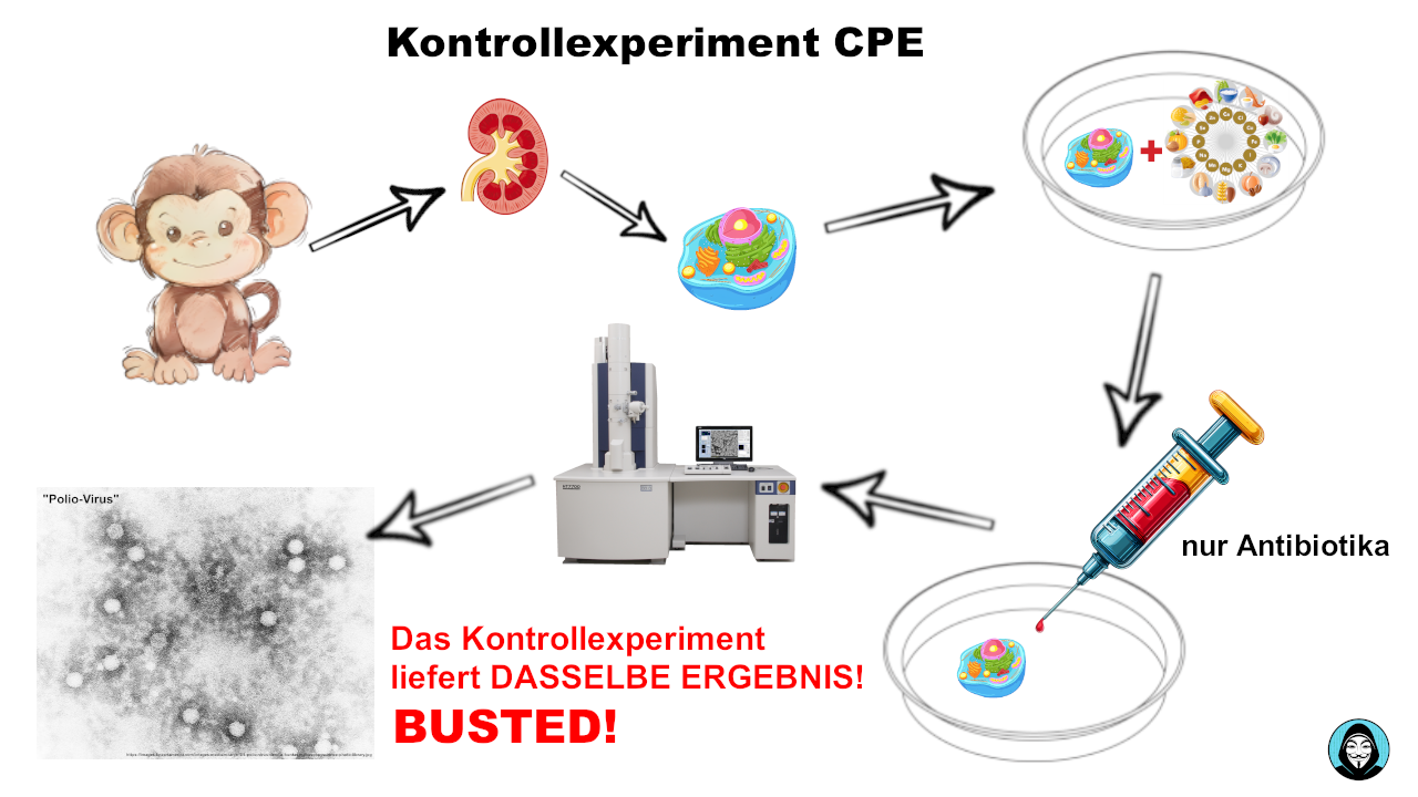 • Und wenn schon das erste Kontrollexperiment dasselbe Ergebnis geliefert hat (Zellzerfall, CPE), finden wir mit derselben Methode eventuell auch hier fälschlicherweise ebenfalls einen „Virus“?