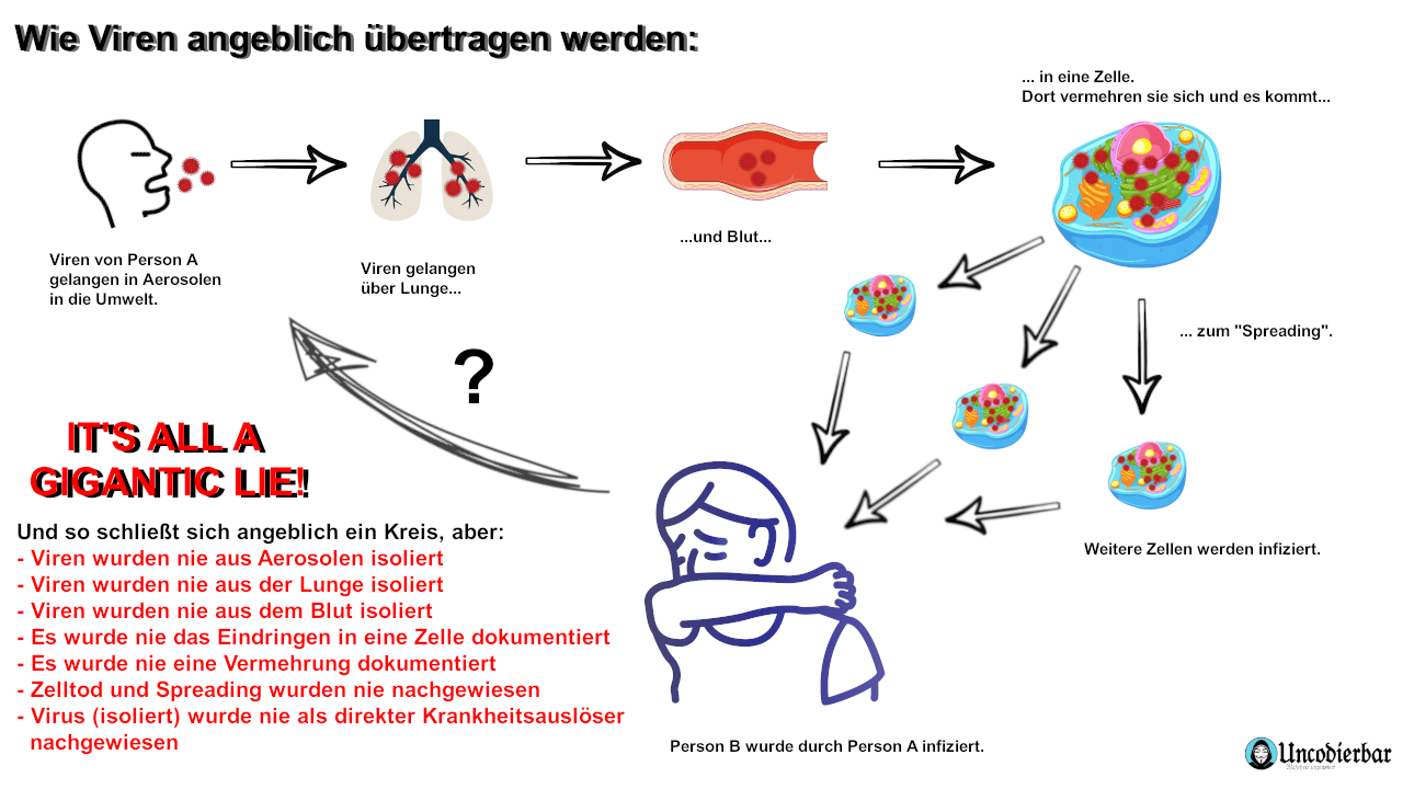 Bei der Frage um die Existenz von Viren ist man also nicht dem Weg gefolgt, den man wissenschaftlich korrekt gehen müsste, um seine aufgestellte Hypothese zu belegen. Wenn es wirklich so wäre, wie man uns eine Virus- oder Krankheitsübertragung in der Schule beigebracht hat, dann müsste man auch jeden einzelnen Schritt in dieser Ablaufkette beweisen können – kann man es nicht beweisen, dann ist es folglich nicht so. Die Hypothese würde zwar nett klingen und alles erklären, sich aber entsprechend der wissenschaftlichen Methodik nicht nachweisen lassen.