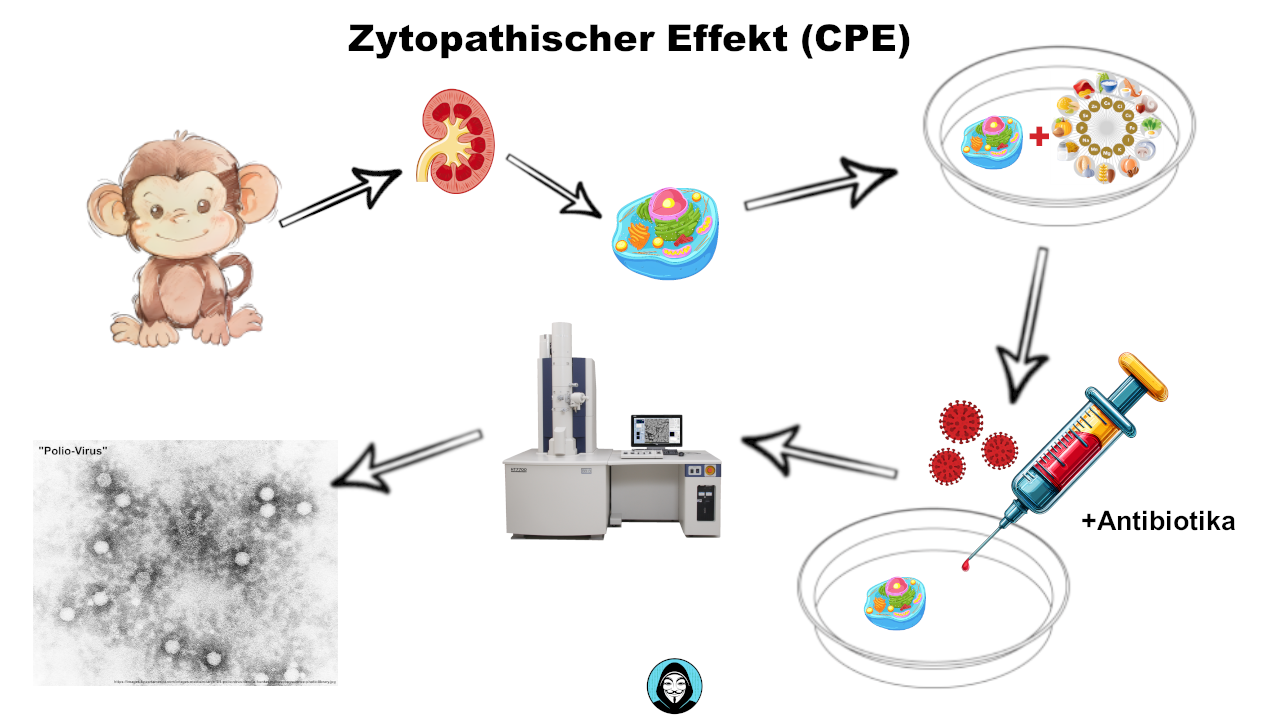 Um einen Virus nachzuweisen werden Zellen aus meist Affennieren künstlich unter Zugabe von Nährstoffen am Leben gehalten. Zu diesen Zellen werden Antibiotika und eine infizierte Probe gegeben und der Nährboden wird entzogen, wodurch die Zelle stirbt. Das Ergebnis wird unter dem Rasterelektronenmikroskop festgehalten und „Virus“ genannt. Besagten Zelltod oder Zellzerfall nennt man „zytopathischen Effekt“.
