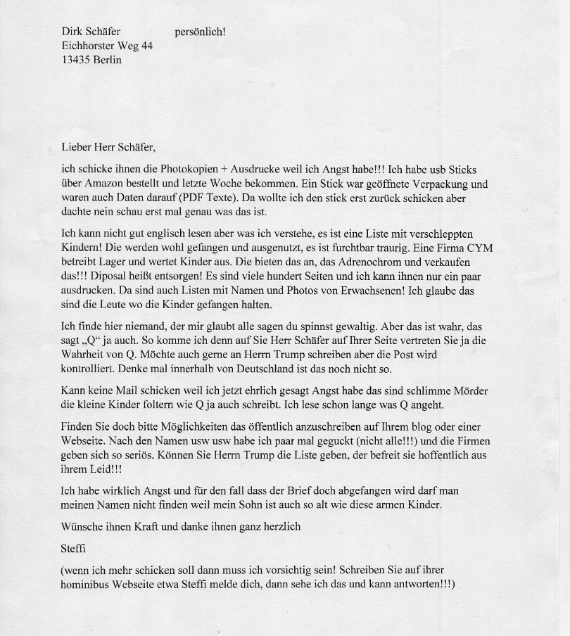 2020 sind in Deutschland Dokumente aufgetaucht, die vermeintlich ein noch viel düsteres Bild zeichnen: Kidnapping und anschließende, jahrlange Folter von tausenden Minderjährigen in angeblich „geschlossenen“ Einrichtungen des US-Militär. Auch deutsche Krankenhäuser (Zivil als auch Militär) tauchen als „Blut-Verkäufer“ auf – mit Millionenumsätzen! Alles mit dem Ziel Adrenochrome zu gewinnen, einen Stoff, den es angeblich nicht gibt, beziehungsweise der nicht aus Menschenblut gewonnen wird. Mittlerweile streitet man schon gar nicht mehr ab, dass es Adrenochrome gibt, es wird heute lediglich behauptet, es würde synthetisch gewonnen.