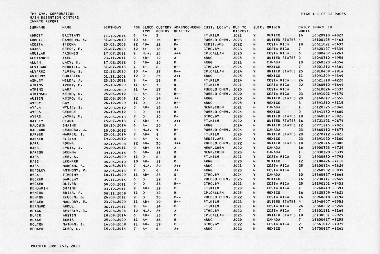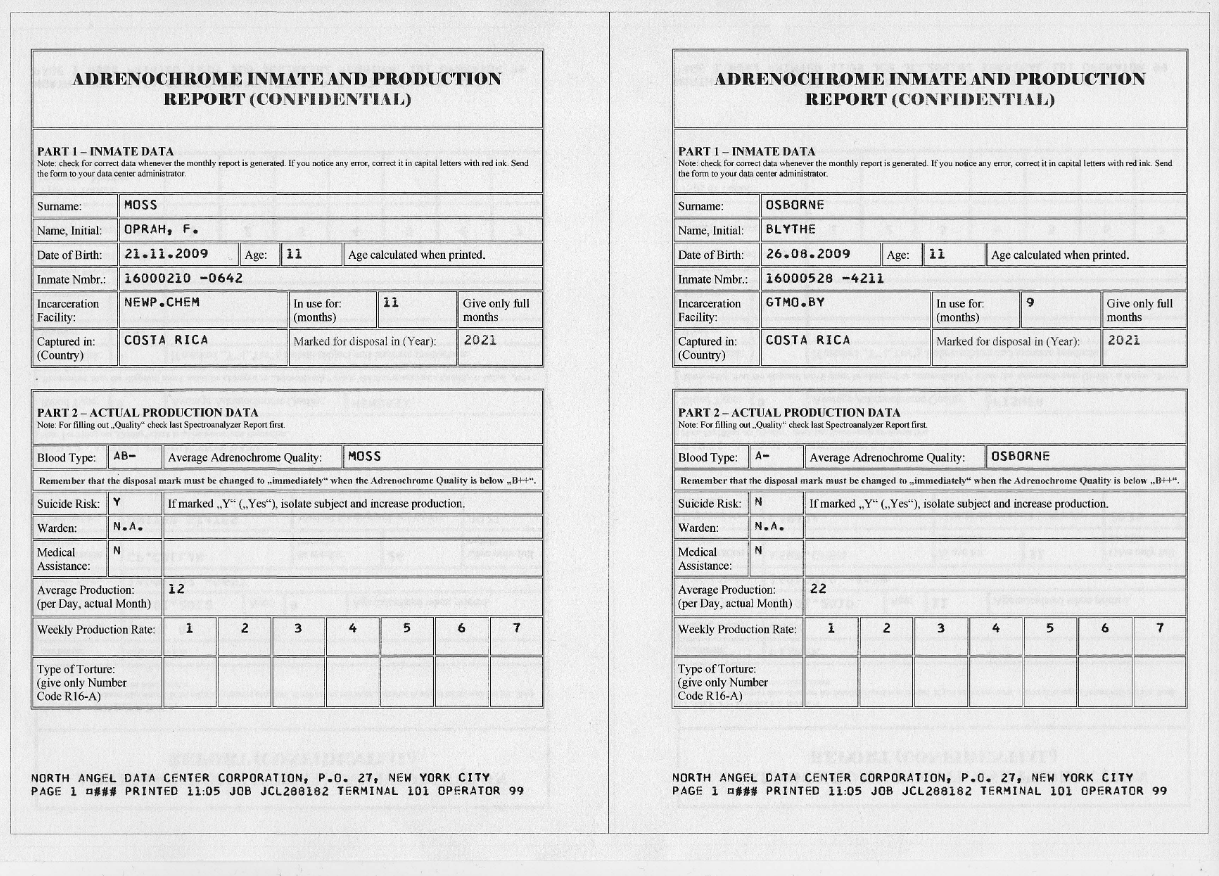 Neben Name, Geburtsdatum und Alter finden sich in den Listen außerdem Informationen über den Bluttypen (blood type), die Dauer des „Haftaufenthalts“ (custody months) – teilweise mehrere Jahre!!! -, der Adrenochrom-Qualität, dem Ort der Anstalt, dem Datum für die geplante Entsorgung (date of disposal), Suizidgefährdung (suic.; bei kleinen Kindern?), ihrem Ursprungsland, der täglichen Quote (daily quota) und ihrer Häftlings-ID.