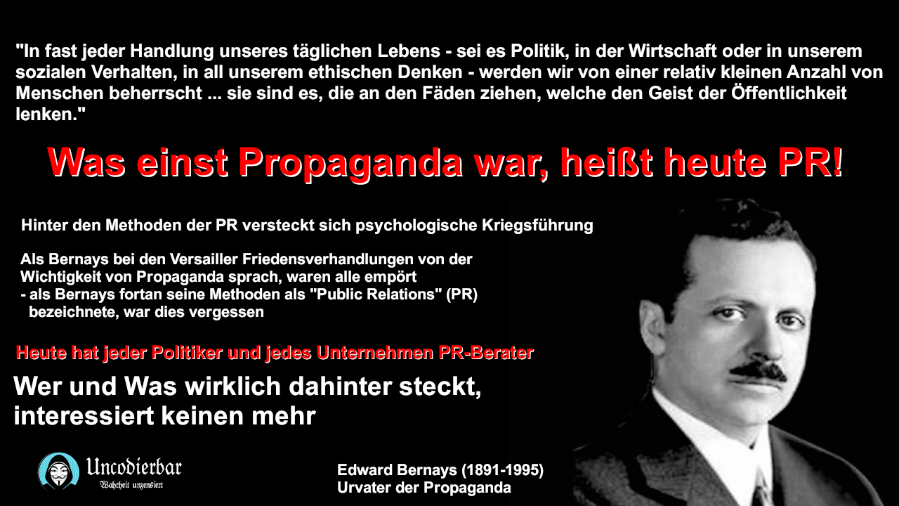 PR-Berater in Politik und Werbung vertreten und verbreiten die Interessen ihrer Geldgeber mithilfe von Propagandatechniken der psychologischen Kriegsführung, die allgemeine Bildung bereitet uns darauf vor Sklaven des bestehenden Systems zu werden und nichts zu hinterfragen und die Medizin ist ein kapitalistisches Konstrukt, welches Menschen nicht heilen, sondern ausbeuten soll. Durch ein perfekt organisiertes, über Jahrzehnte andauerndes Schauspiel gelang so ein paar wenigen, machthungrigen Superreichen, Kontrolle über die gesamte westliche Welt und alle ihrer Einflussbereiche zu nehmen.